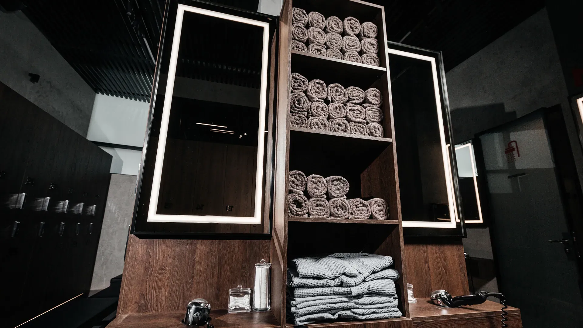 А это наши раздевалки — семейная, мужская и женская. Проще рассказать о том, чего там нет, но мы все же попробуем перечислить, чего ожидать: · Кулер с подачей холодной, горячей и газированной (!!!) воды · Сушилка для купальников (кроме семейной раздевалки · Профессиональные швейцарские фены мощностью 2000Вт · Сауна из канадского кедра, рассчитана на 4-6 чел (кроме семейной раздевалки) · Закрытые душевые (гель для душа, шампунь) · Раковины умывальников оснащены системой DYSON: подача воды, сушилка для рук и диспенсеры с бумажными полотенцами · Арендные полноразмерные кабинки, с полками для обуви, крючками и вешалками · Теплые полы