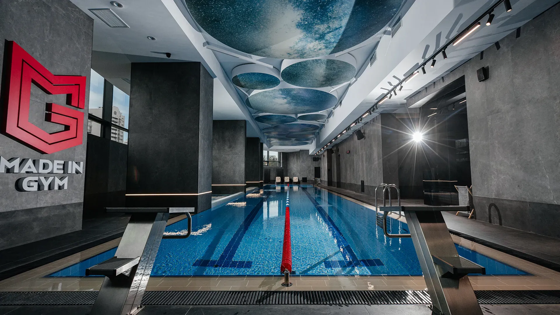 Для любителей расслабиться после тренировки зона с бассейном и саунами: · 25-метровый бассейн с двумя дорожками · Две гидромассажные ванны · Мраморный хамам, рассчитан на 10 человек. Стеклопакет из закаленного стекла, паровой удар, ароматизация — все, как мы любим · Сауна из канадского кедра, рассчитана на 10 человек · Стойка с оборудованием для бассейна · Шкаф с полотенцами · Теплый пол · Имитация звездного неба на потолке (но это лучше один раз увидеть, чем сто раз услышать!)
